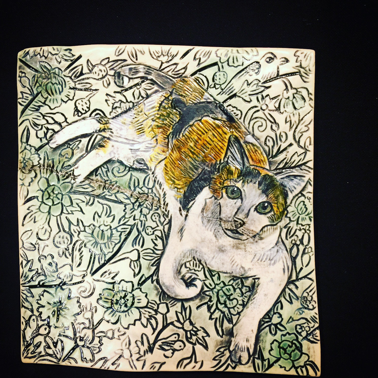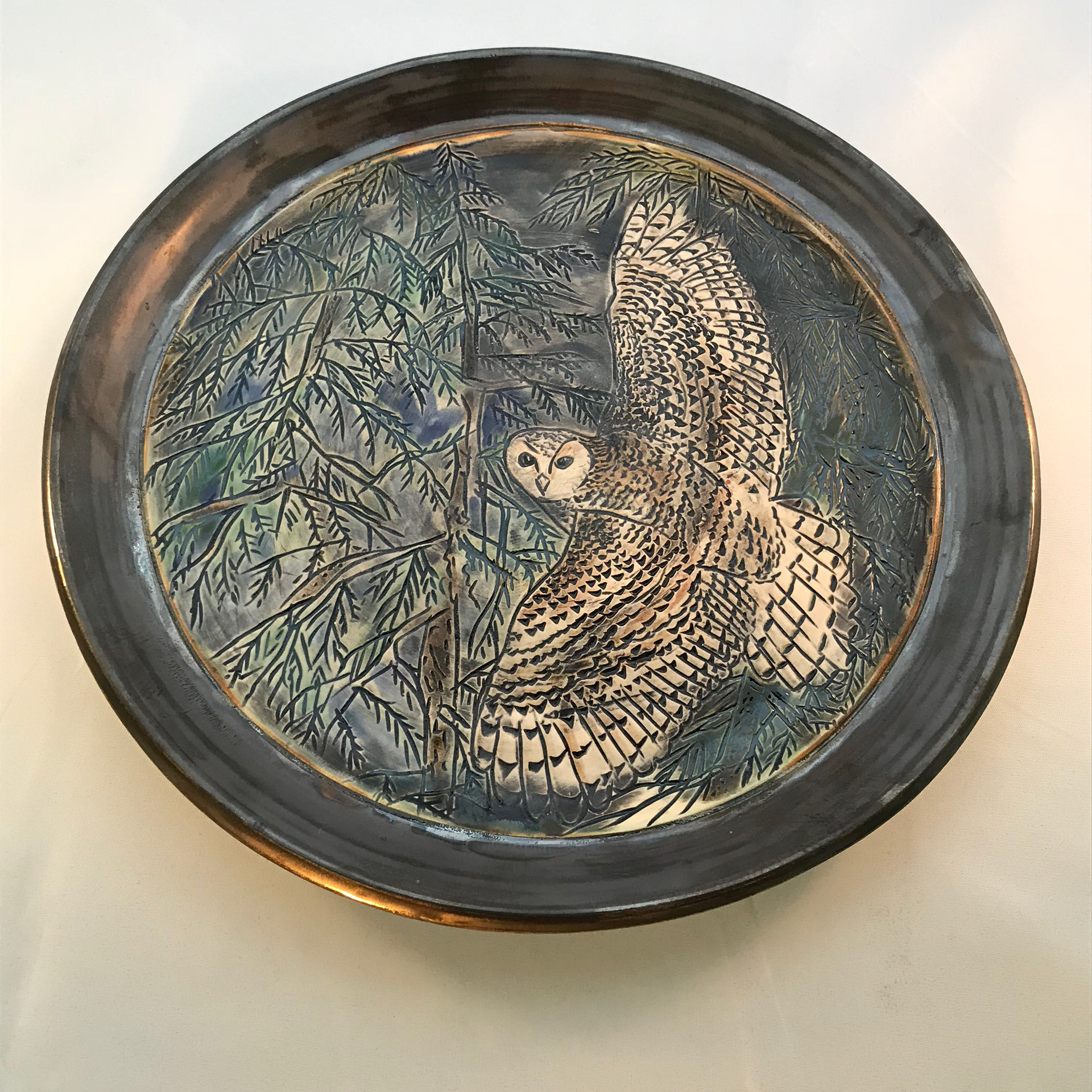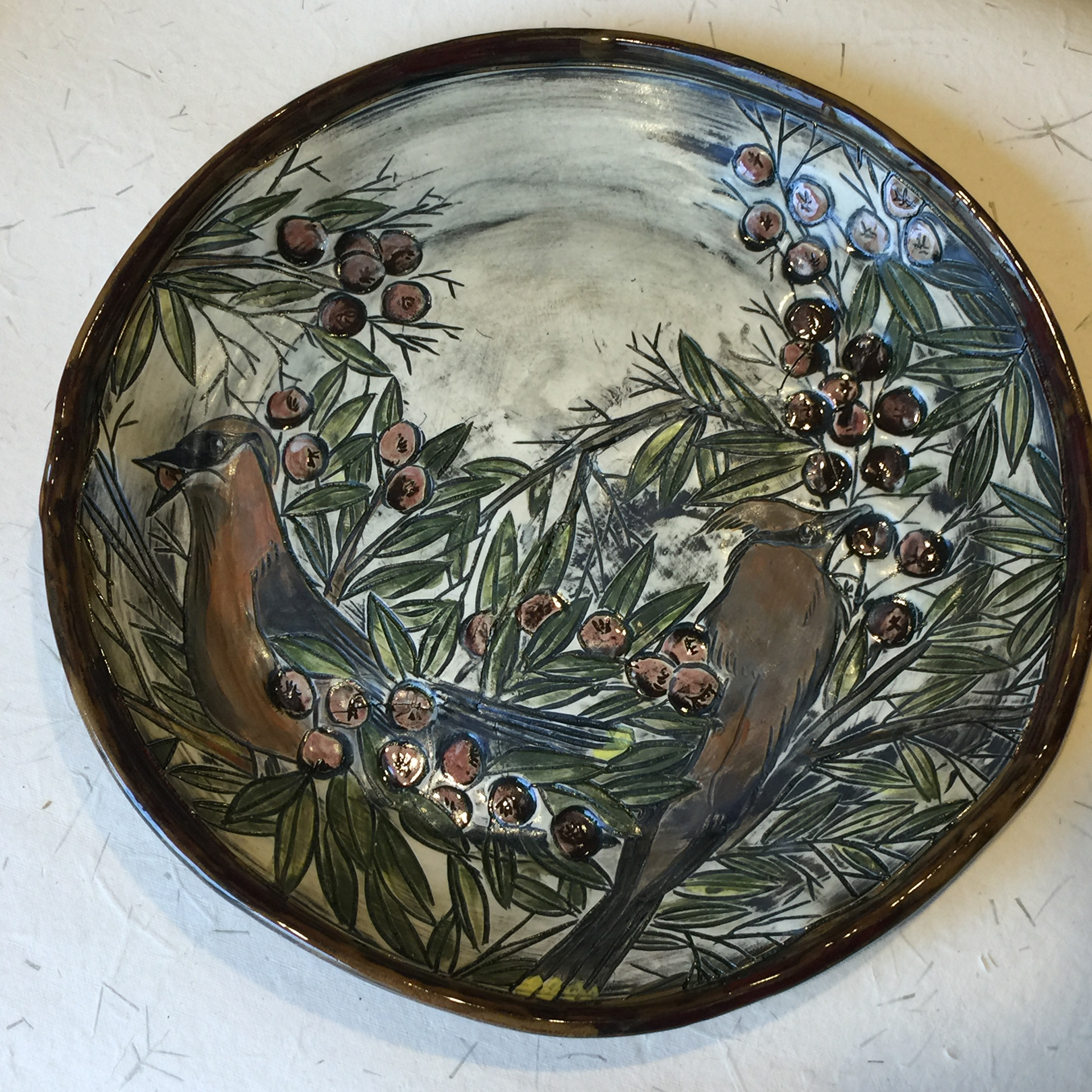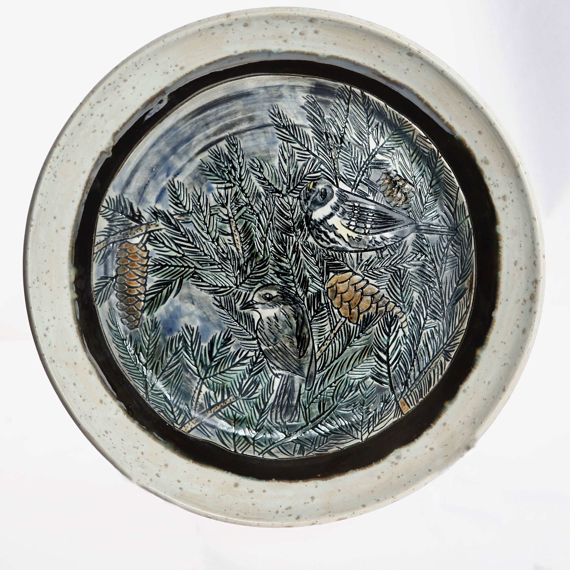 These illustrated clayworks are all created as one-of-kind objects here in my studio in the foothills of the Appalachians. Thrown on the wheel, manipulated by hand, heavily incised with a sgraffito technique, and finally hand-painted and -glazed.