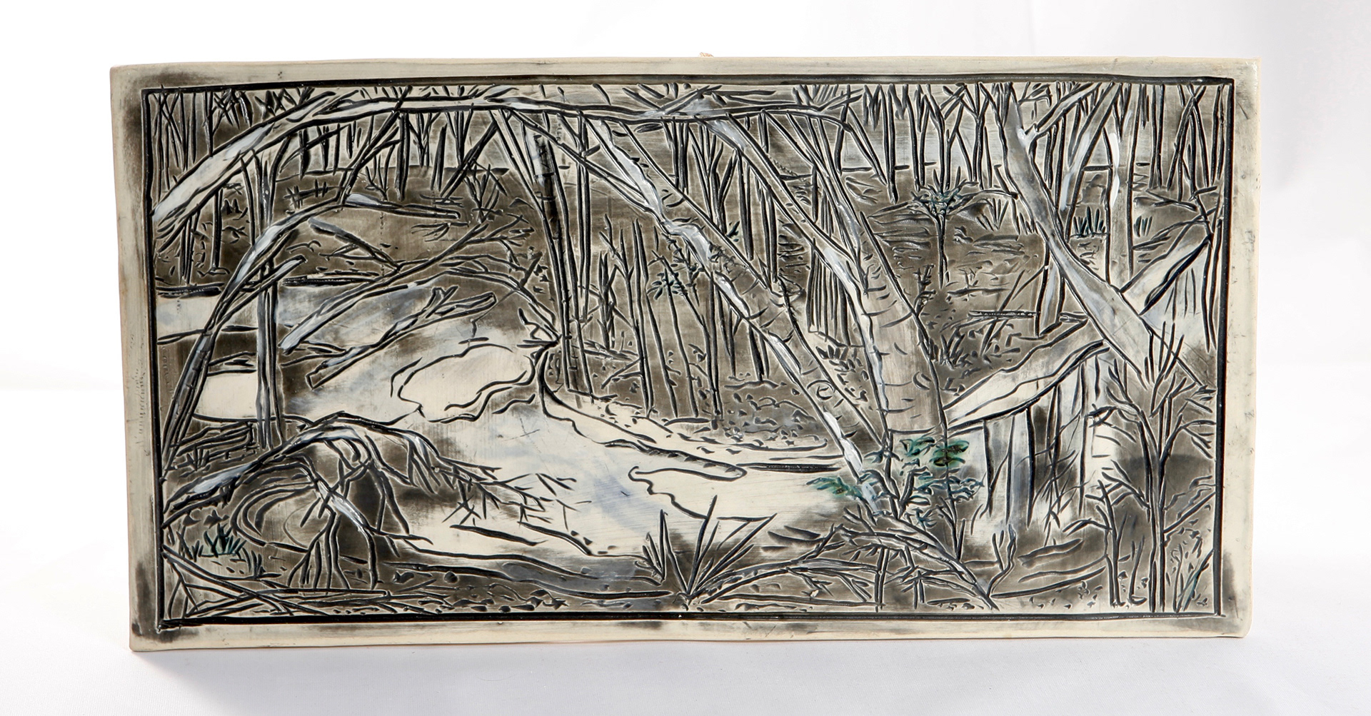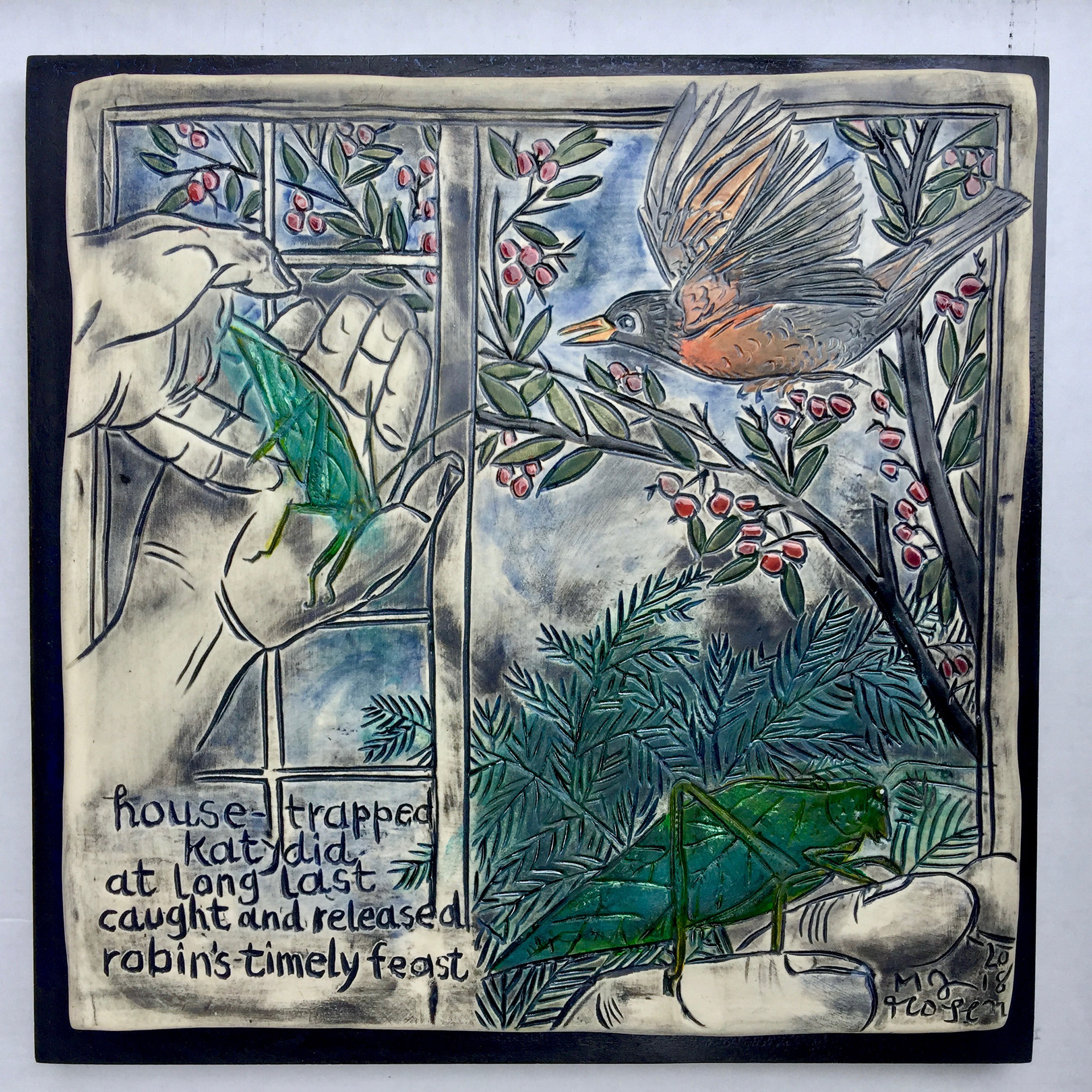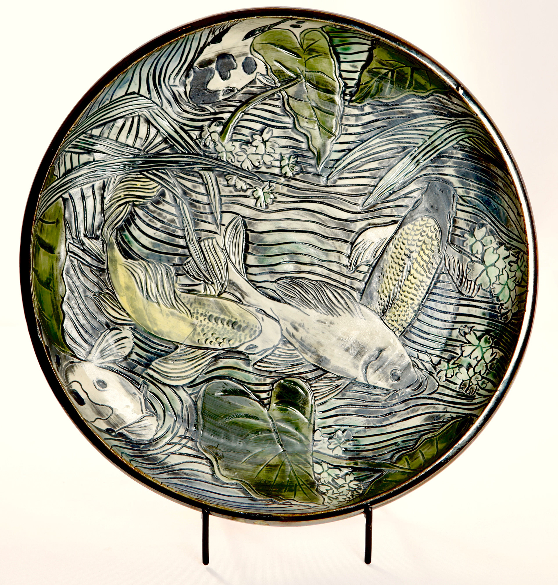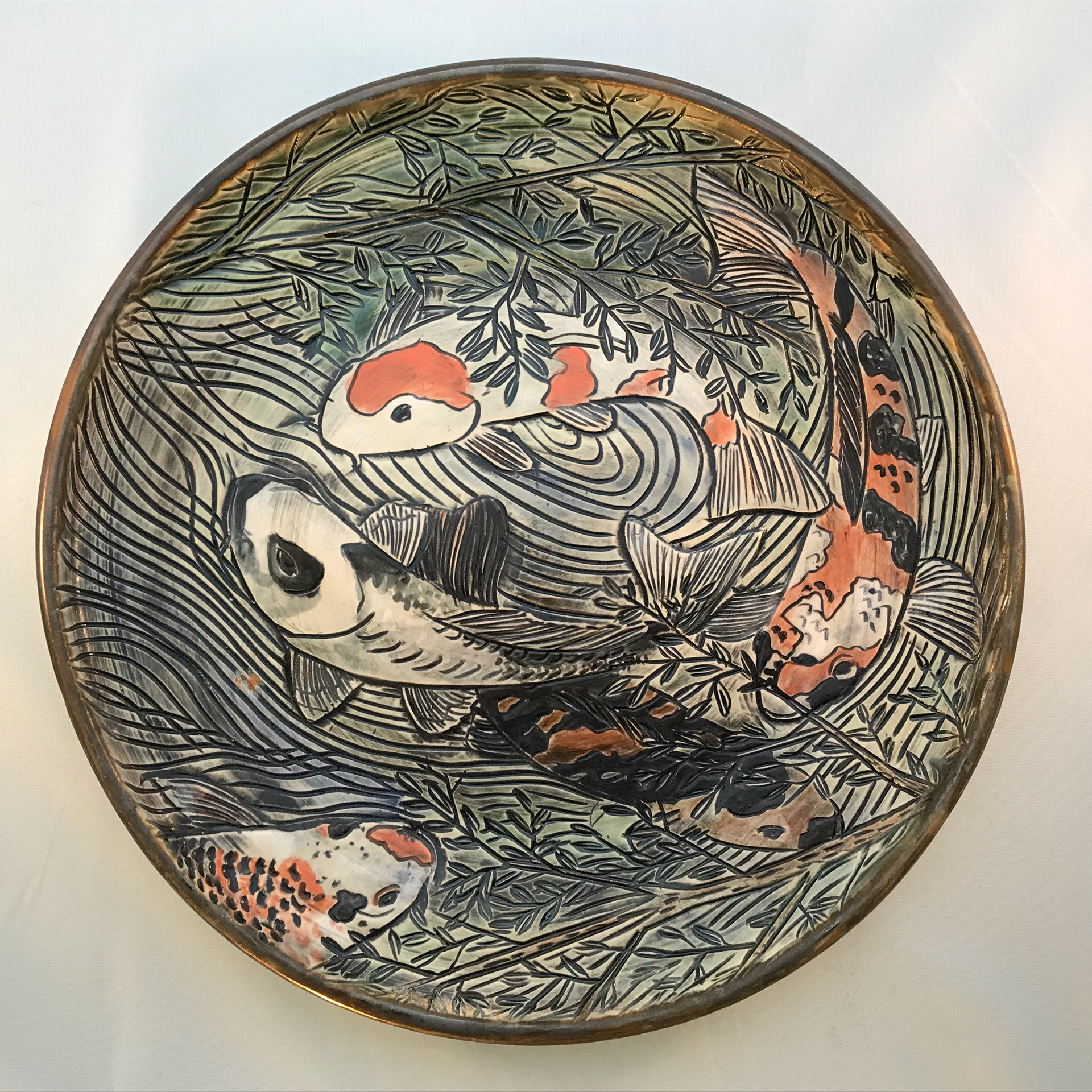 These illustrated clayworks are all created as one-of-kind objects here in my studio in the foothills of the Appalachians. Thrown on the wheel, manipulated by hand, heavily incised with a sgraffito technique, and finally hand-painted and -glazed.
