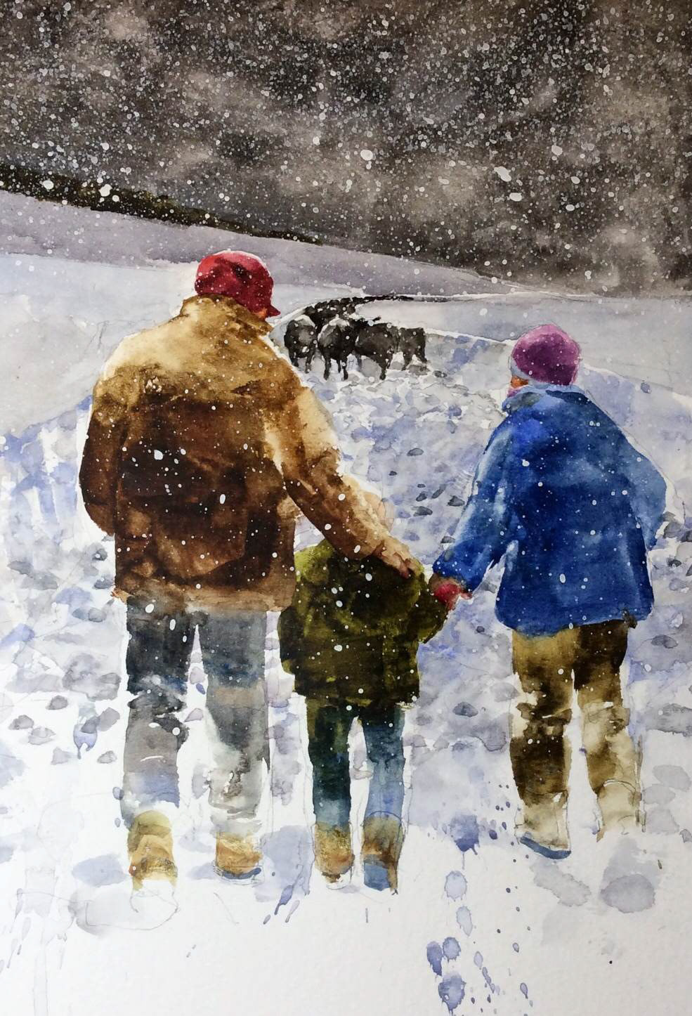 In Stan Fellows’s atmospheric watercolors, we glimpse happy times before the storm: the people building a little family of snowmen the same size as themselves and cross-country skiing, “their overlapping parallel tracks [leaving] an empty musical staff on the blank pages of the smooth fields . . . and their boot prints [adding] the notes.” But it is the dog in this adventure that captures our hearts, the working animal that fights her way through miles of deep, ice-topped snow to round up “three lost members of someone’s herd.” When the humans begin to fail in the deep drifts, the heroic dog—and, really, is it not heroism?—hits upon a remarkable stratagem to make straight their way to safety in this snug and handsome volume.